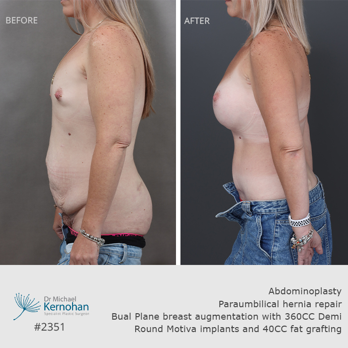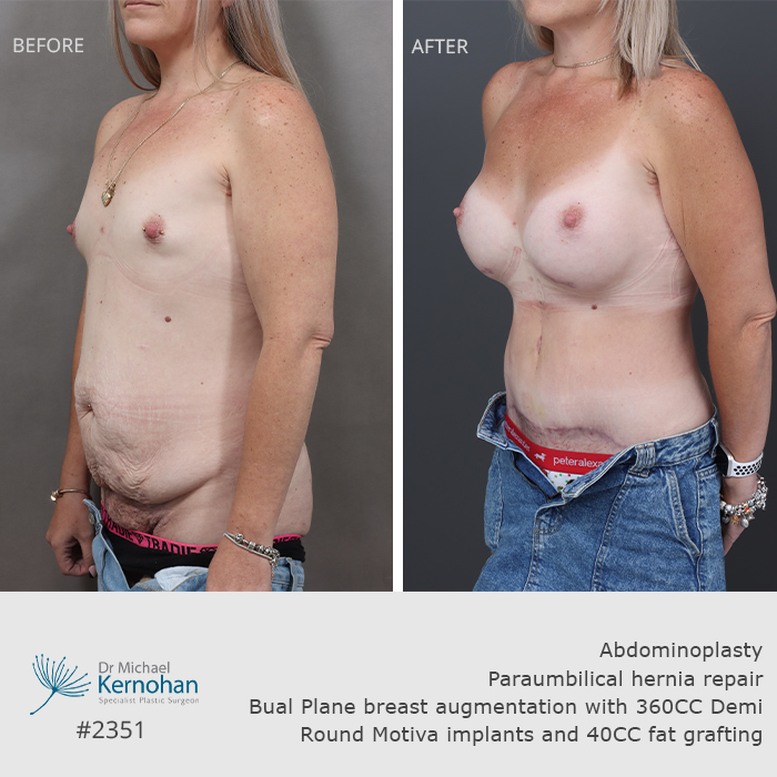 Abdominoplasty, paraumbilical hernia repair, Bilateral breast augmentation with fat grafting.