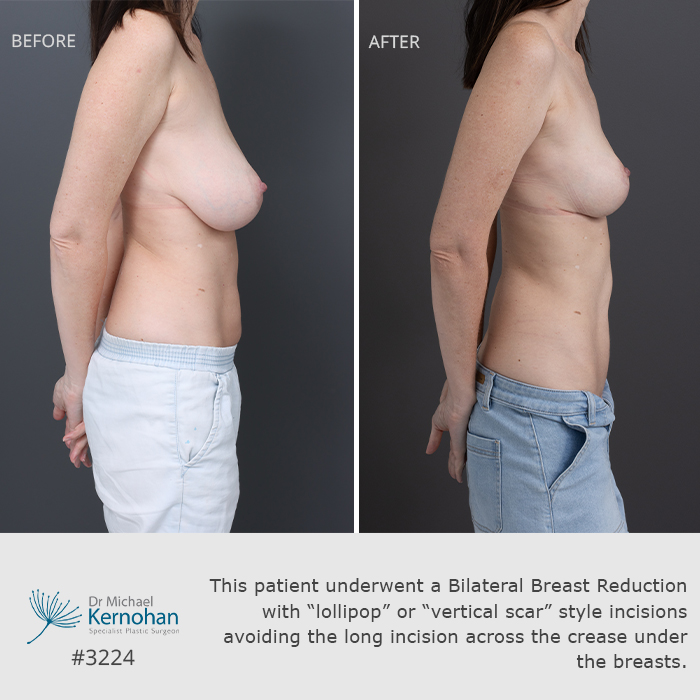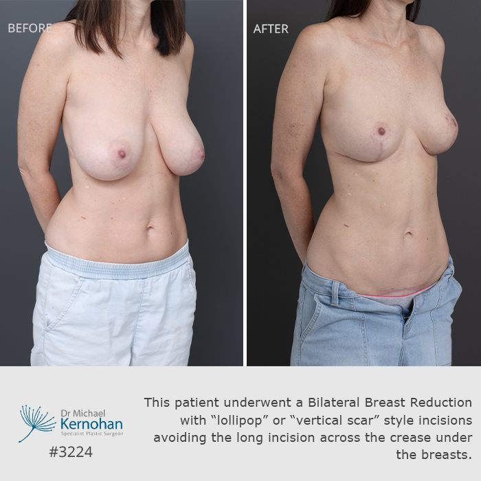 This patient underwent a Bilateral Breast Reduction with “lollipop” or “vertical scar” style incisions avoiding the long incision across the crease under the breasts. This is called the “Hall-Findlay” technique after a famous Canadian female surgeon. It offers natural shape, elevation of the base of the breast and less scarring. It is not suitable for every patient.