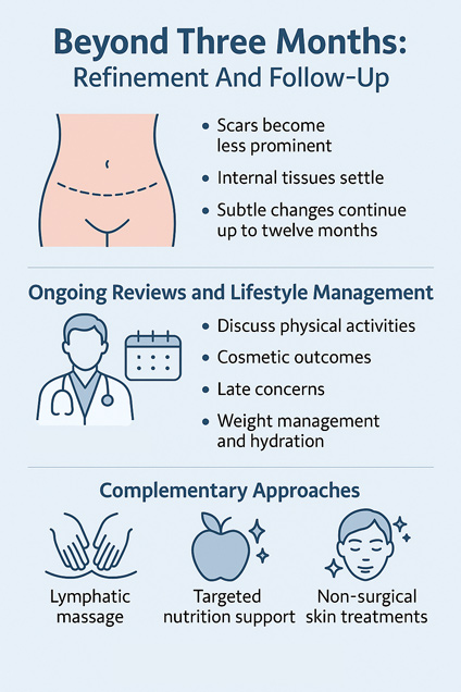 While the most intensive part of recovery may be over by the three-month mark, healing continues for many months. Scars become less prominent, internal tissues settle, and the abdomen starts to reflect the full benefit of the procedure. It is normal for subtle changes to continue up to twelve months post-operatively.